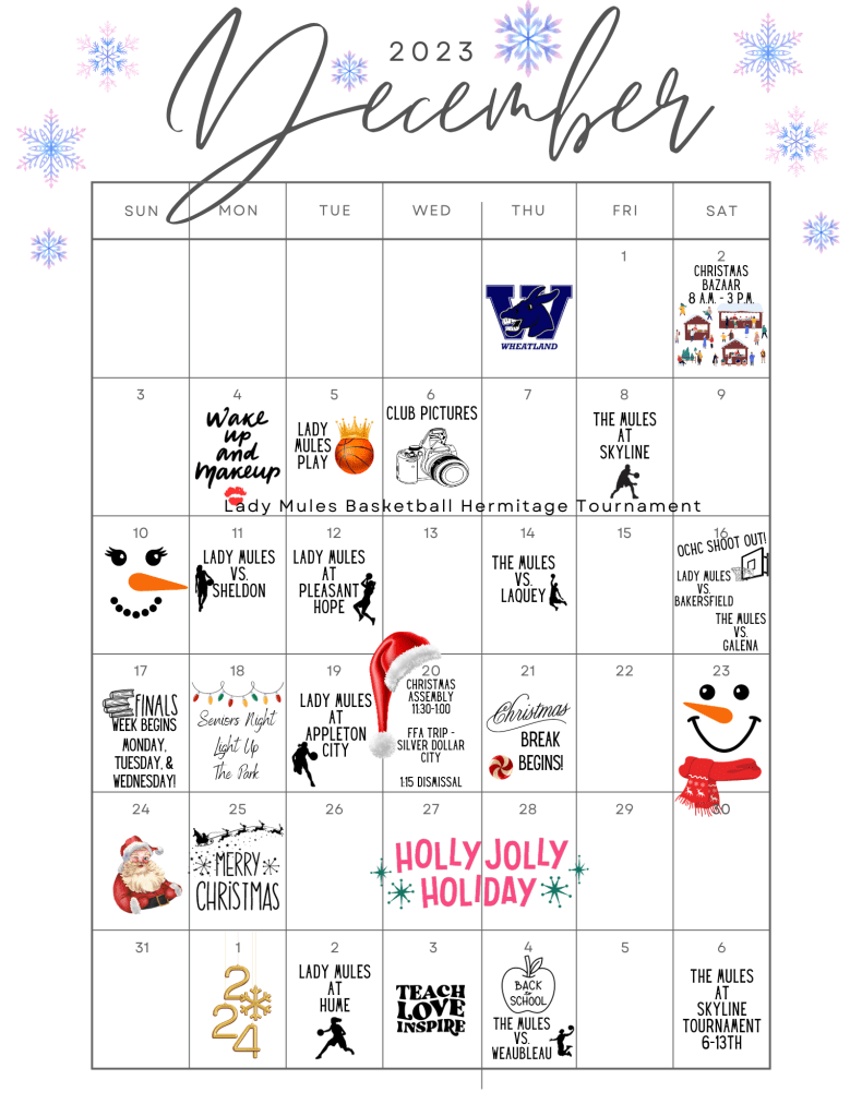 Uncategorized December 2023 Calendar Date: December 4, 2023Author: The Daily Mule 0 Comments All events and specific times can be found at: https://www.wheatlandschool.com/events Share this: Click to share on X (Opens in new window) X Click to share on Facebook (Opens in new window) Facebook Like Loading...